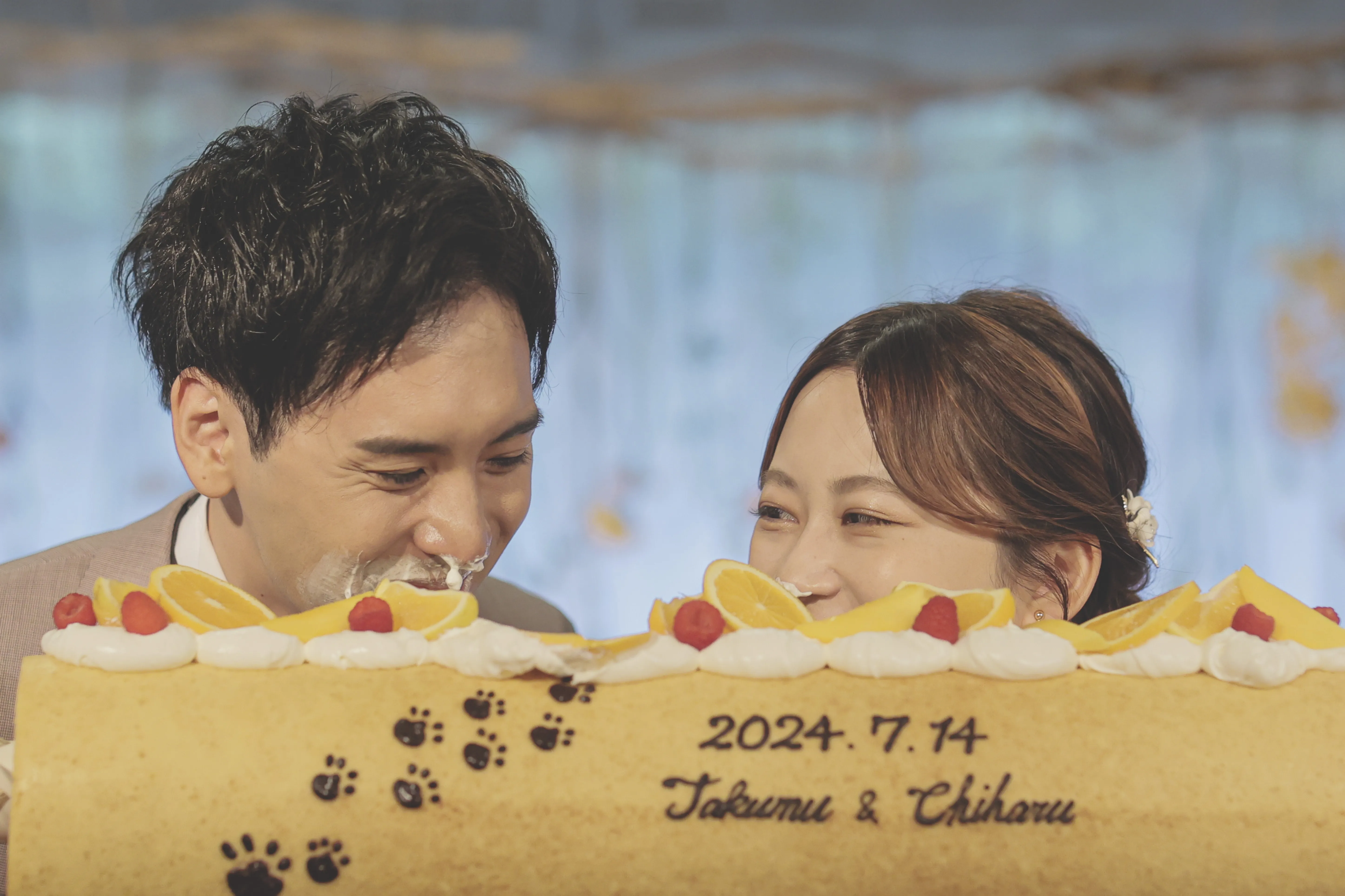 ケーキは猫の足跡をデザインしたバームクーヘン*パクっと食べる姿はおふたりのシャッターチャンス?
